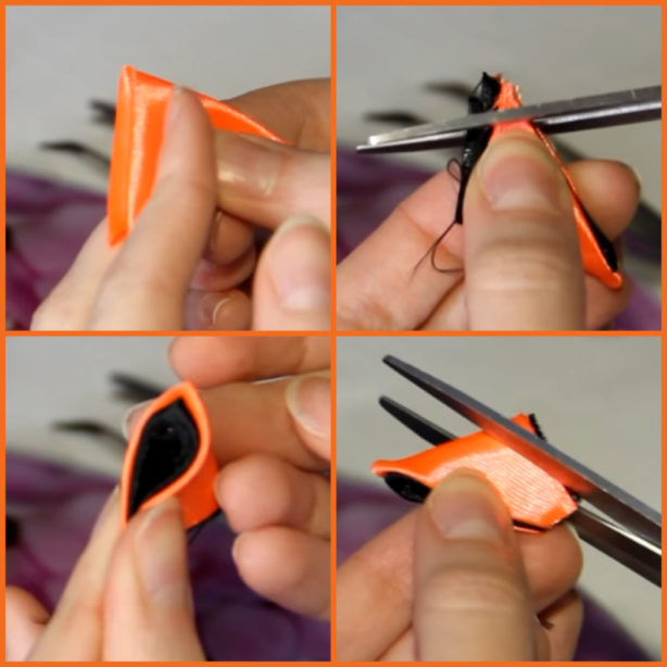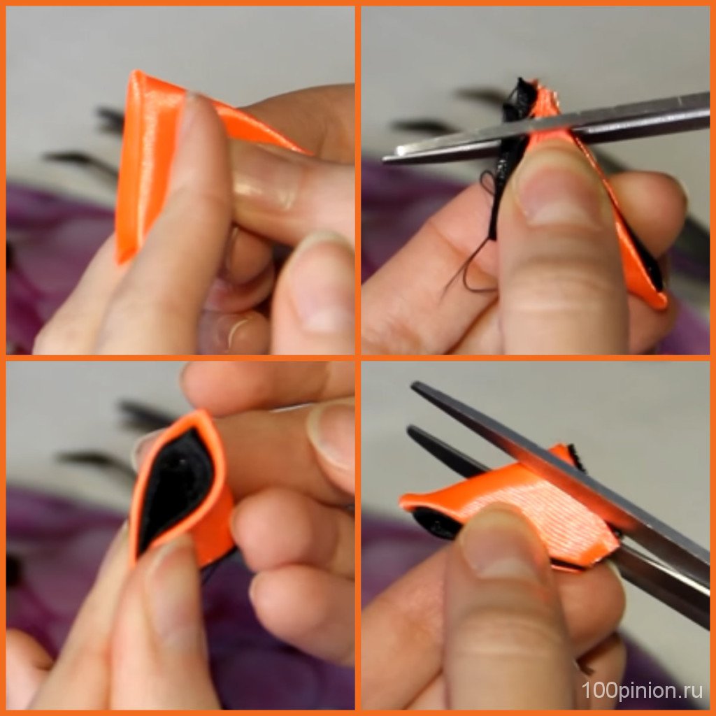 В самом начале необходимо нарезать из черной и оранжевой ленты квадратики 5 на 5 см. Количество определяете в зависимости от величины цветка. В данном случае получится 14 кусочков в общей сложности. Берем оранжевый квадрат и складываем в треугольник, а потом еще раз. Такую же процедуру делаем с черным квадратом и соединяем 2 цвета друг с другом. Делаем маленький срез внизу и поджигаем зажигалкой или над свечкой. То есть запаиваем, чтобы нитки не расползались. Потом сбоку срезаем полоску и еще раз запаиваем. Так, у нас получится 7 двойных лепестков. Их нужно склеить между собой.