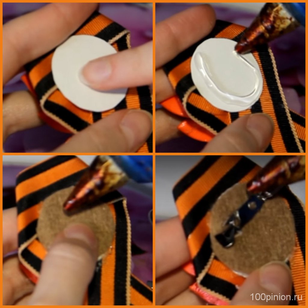 Вырезаем кружок из картона и фетра диаметром 3 см. С задней стороны георгиевской ленты крепим картонный круг при помощи клея, а потом сверху приклеиваем кусочек фетра. И окончательным этапом закрепим булавочку. А с лицевой стороны нужно приклеить сами лепестки.