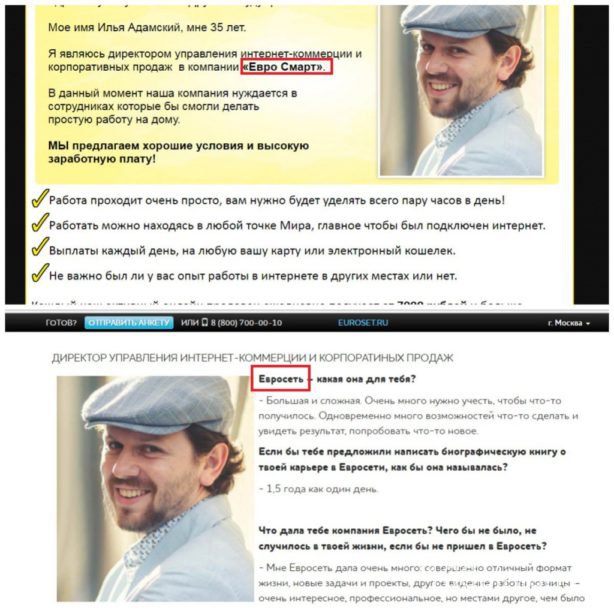 После блокировки одного клона компании Евросеть мошенники тут же создали новый. Суть проекта осталась та же — заработок на обработке онлайн заявок с денежными выплатами от 7000 рублей. Владелец сайта даже не боится прикрываться известным магазином по продаже сотовых телефонов.