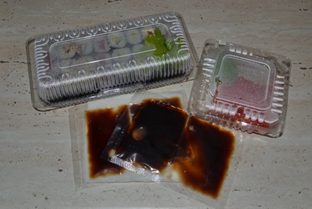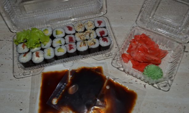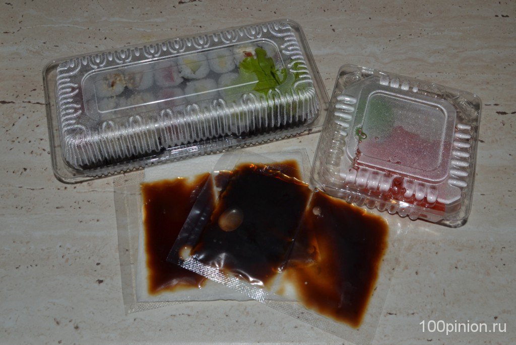 Вот только пакетики под соус не удобны. Хотелось бы или маленькие пластиковые контейнеры под него, или бутылочку. А то бывает, что пакетик рвется так, что все проливается. Палочки, васаби и имбирь включены в стоимость. Имбирь у них всегда вкусный.