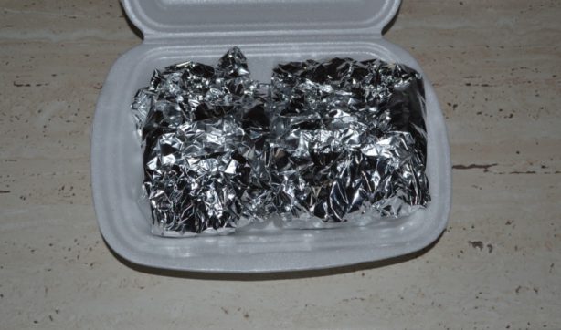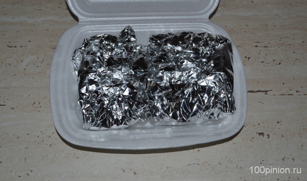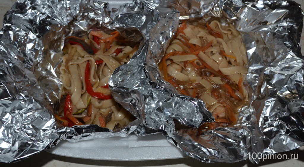 Лапшу доставляют в белой пластиковой упаковке, а внутри фольга для поддержания тепла.