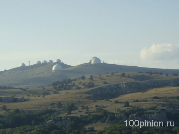 Чуть дальше видны круглые белые сооружения (шары) — радарные установки воинской части под куполами. Поэтому не удивляйтесь, если на входе к зубцам Ай-Петри увидите мужчин в форме.