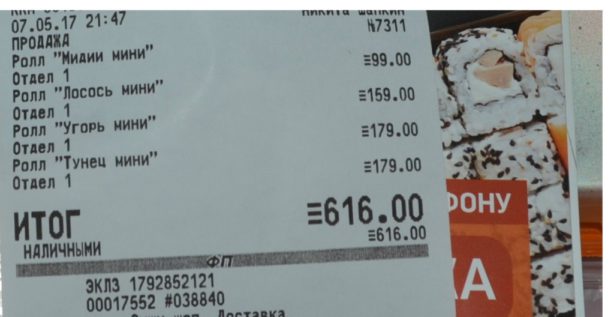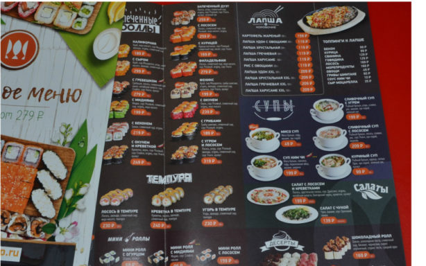 Обычно берем 4 порции, на двоих. По одной как-то мало. В наш заказ вошли роллы «Мидии», «Лосось», «Угорь» и «Тунец». Всего вышло на 616 рублей. Ценники обычные, некоторые сеты, например, дешевле, чем в «Киото».