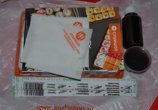 Больше всего нравится, когда в таких заведениях соус разлит по бутылочкам и предоставляется специальная емкость для разлива. Салфетки, палочки, васаби и имбирь, как и должно быть, кладут бесплатно.