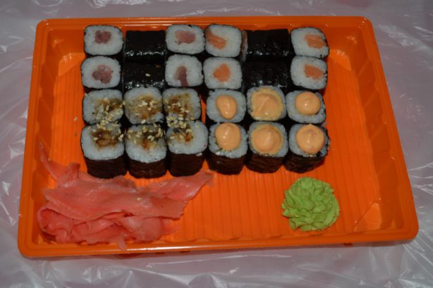 На днях с мужем решили опробовать роллы из нового заведения города Домодедово — Суши Шоп, которое расположено на месте бывшего продуктового магазина и кафе Attratoria. Сейчас там открыли ресторан Гриль Хаус, а сбоку Суши. Мы не стали оставаться в самом кафе, так как есть маленькие дети и оформили заказ с собой. Для начала решила попробовать их простые роллы, т.е. когда рис находится внутри листов нори.