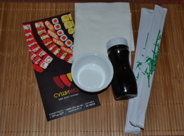 Находится Суши Wok  по улице 25 лет Октября, д. 18, а можно оформить доставку (работает круглосуточно). Заказ непосредственно в заведении муж ждал 20 минут. Единственное, что мне понравилось, форма подачи соуса и мисочек под него. Выглядит так: