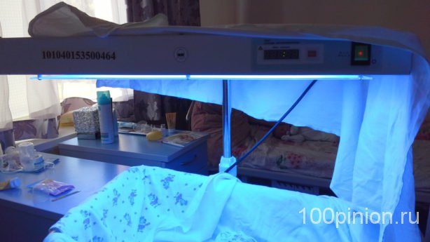 А это мой младший пупс, как раз подхватили желтуху и поэтому задержались перед выпиской еще на один день. Там, прямо в палате делают процедуру ультрафиолета, при которой обязательно нужно следить за ребенком (глазки д.б. прикрыты).